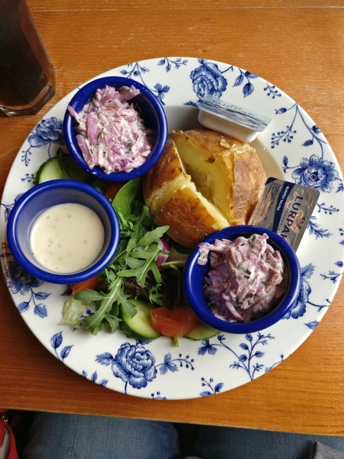 Am ales un restaurant din centru, întins pe trei niveluri, în stil englezesc, cu tematică literară. Tablourile de pe pereţi ilustrau scriitori celebri şi evenimente care îi legau de Bournemouth. Eu mi-am comandat un ,,Jacked potato”, mai apoi descoperind că e un banal cartof copt, pe care eram invitată să adaug unt sau nişte sosuri.