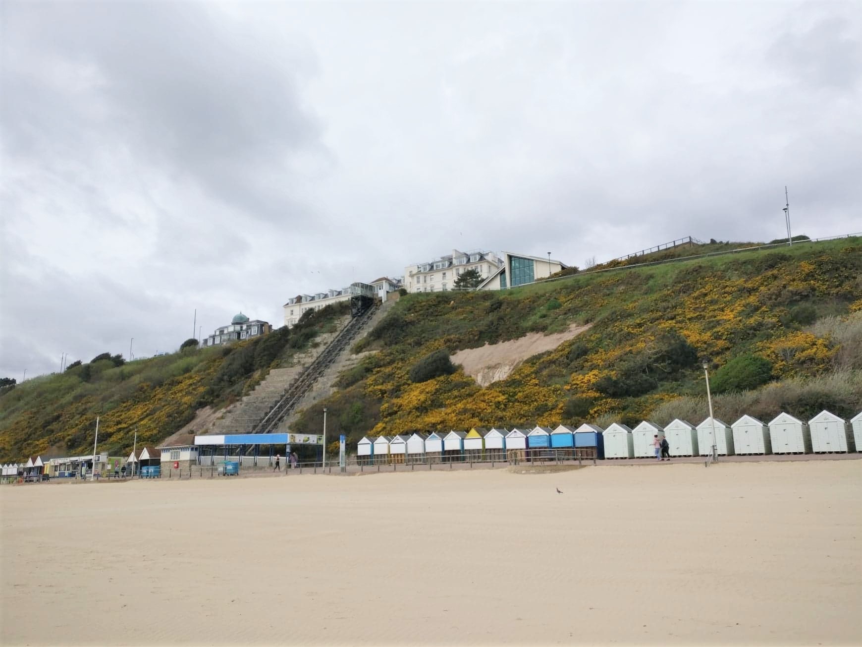 Un trenuleţ turstic ,,hop on train” invita puţinii turişti la o plimbare între cele două puncte terminus ale zonei de promenadă: Branksome Chine şi Boscombe. Locurile mai înalte de pe plajă erau acoperite cu nişte arbuşti cu flori galbene. Nu erau plantaţi, făceau parte din flora spontană, i-am regăsit în diverse alte locuri. Pe plajă erau înşirate zeci de căsuţe de lemn, aflate încă în hibernare.
