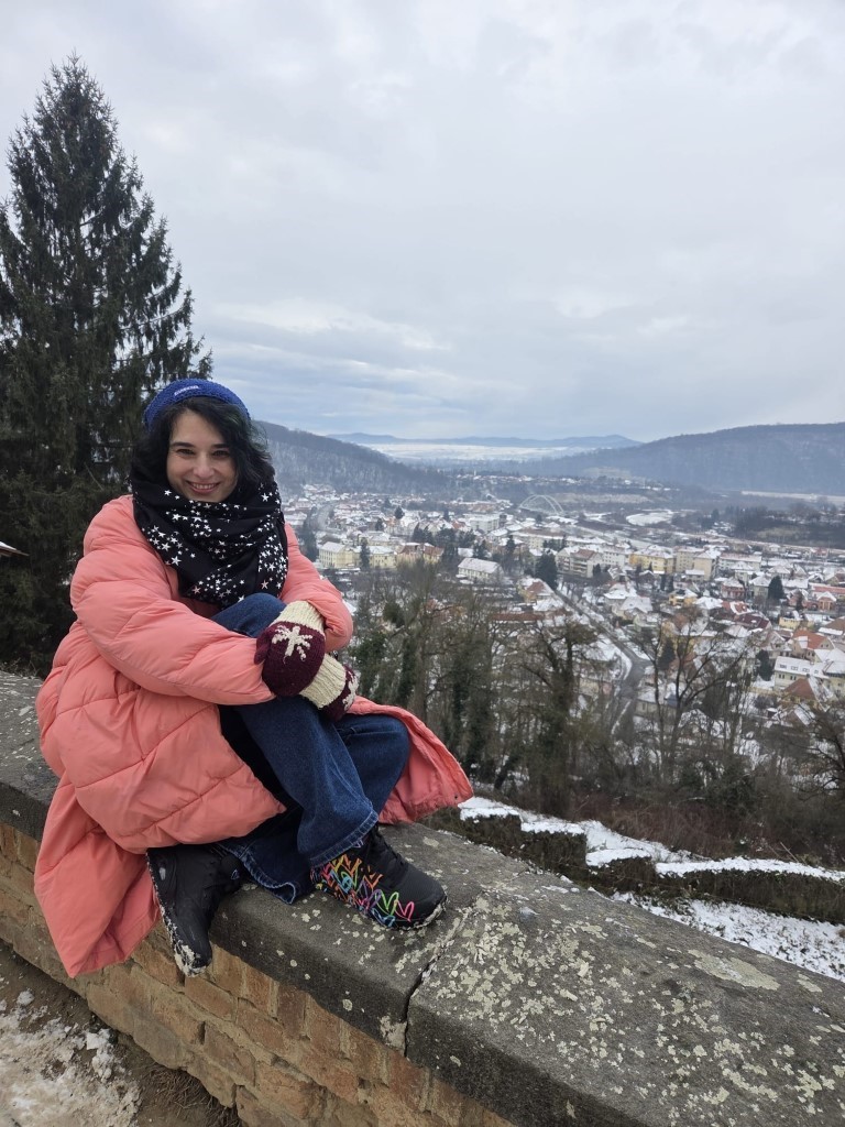 Aerul era rece, dar curat, cu miros subtil de lemn și de foc din coșurile fumegânde ale caselor. De sus, am văzut acoperișurile roșii, turnul cu ceas și străduțele care se pierd în curți ascunse.