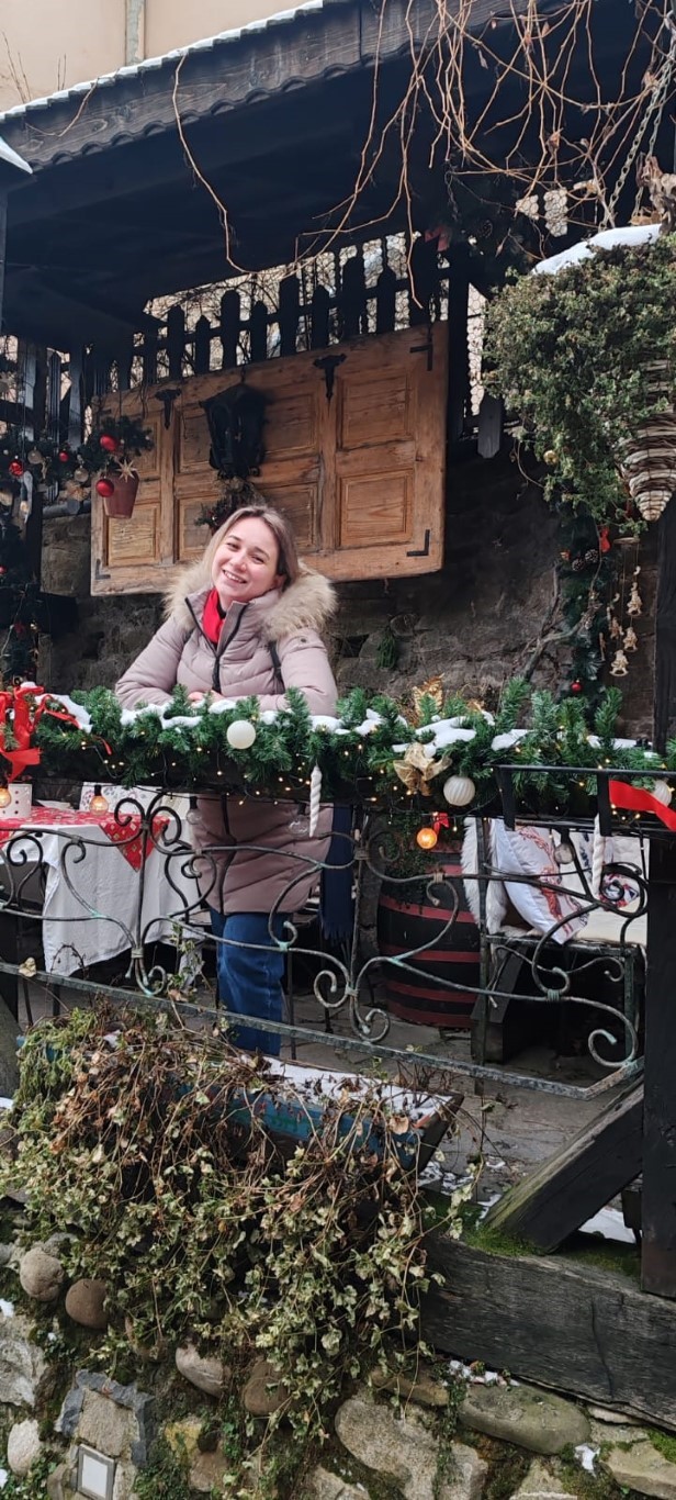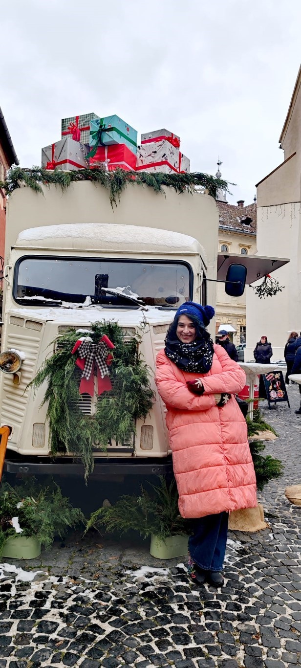 La întoarcerea spre casă, am poposit câteva ore în Cetatea Sighișoarei, un loc care, indiferent de anotimp, te întâmpină cu farmecul său discret și atemporal. Era împodobită pentru sărbătorile de iarnă: luminițe albe și aurii atârnau peste fațadele colorate, globuri delicate agățate la balustrade, coronițe pentru uși, ghirlande, câțiva brazi împodobiți care scoteau din umbră reflexe strălucitoare. În centru am găsit același trenuleț turistic care-și oferea serviciile și în vară. Două sănii din alte vremuri își așteptau renii imaginari lângă bradul impresionant. Spre surprinderea mea, Sighișoara era mai puțin aglomerată decât de obicei, ceea ce îi accentua atmosfera magică și tihnită.