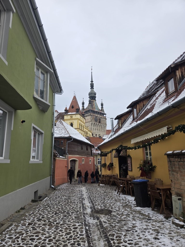 Străduțele pietruite șerpuiau printre case medievale cu fațade pastelate, fiecare cu propriul farmec și cu povești ascunse în crăpături și grinzi de lemn vechi. Am făcut poze la fiecare colț care mi-a atras atenția: o ușă pictată, o fațadă decorată cu ursuleți de pluș, un lampadar ce lumina ninsoarea, food truck uri îmbietoare pentru vizitatori. Fiecare detaliu părea că-mi șoptește câte ceva din trecutul cetății, iar eu mă simțeam ca un invitat într-o poveste cu secole vechi.